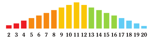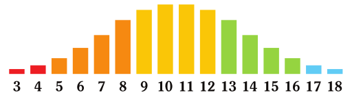 Play It Safe To play it safe roll a 3d6. This is what nearly everyone does on a day to day basis. Because of Dice Curve Probability you will most likely end up with a roll of 7 to 14, as shown in the graphic below where the taller the colored bars are the more likely you will be to roll them. Without any modifiers, the red bars are a crash fail, the orange bars are a full fail, the yellow bars are a half fail, the green bars are a single success and the blue bars are a double success.